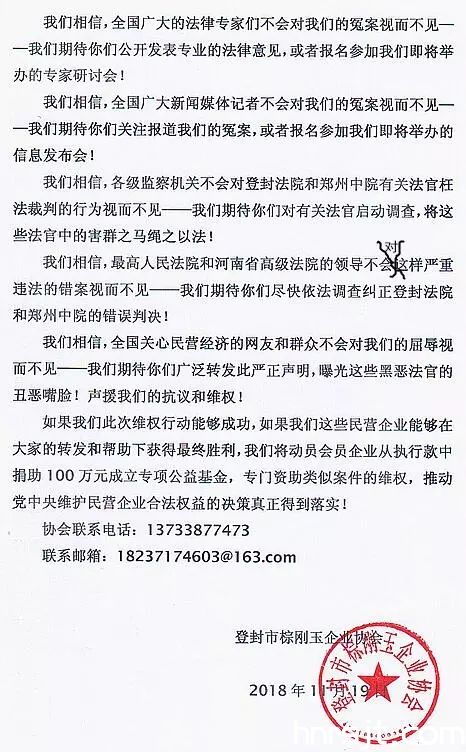該文章中還有一張發(fā)表于2018年11月19日,蓋有“登封市棕剛玉企業(yè)協(xié)會(huì)”公章的公開聲明。